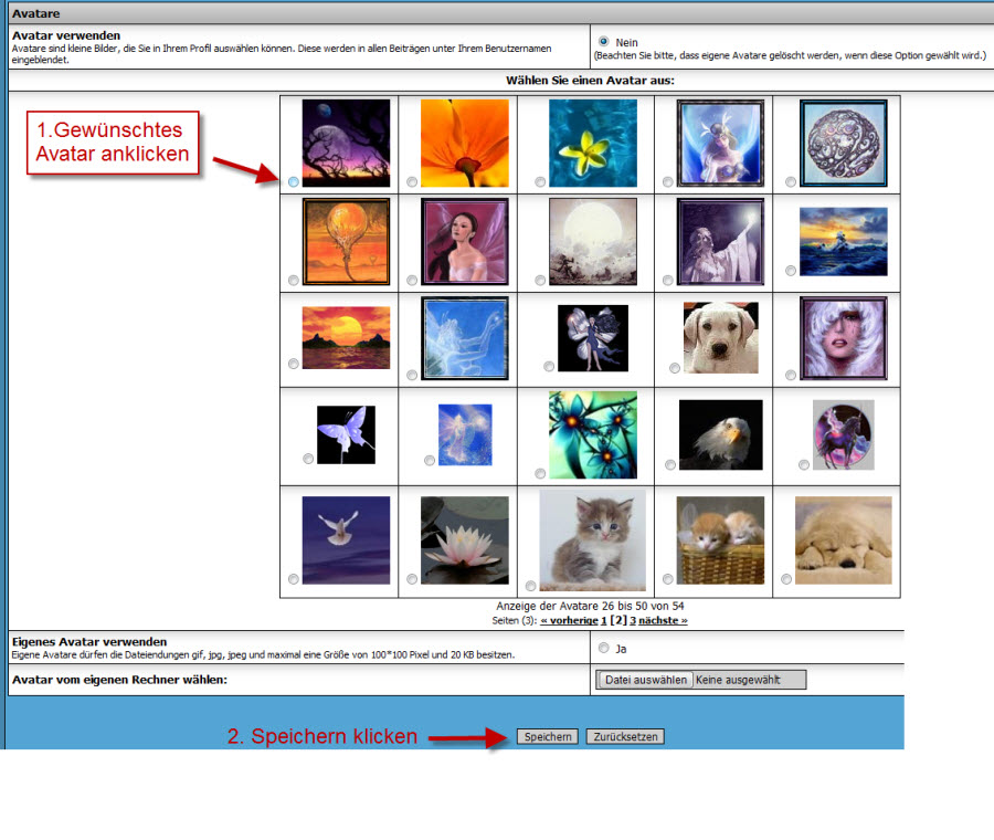 Hier wird Euch in kleinen Schritten gezeigt wie ihr ein Avatar aussuchen könnt welches wir Euch zur Auswahl stellen