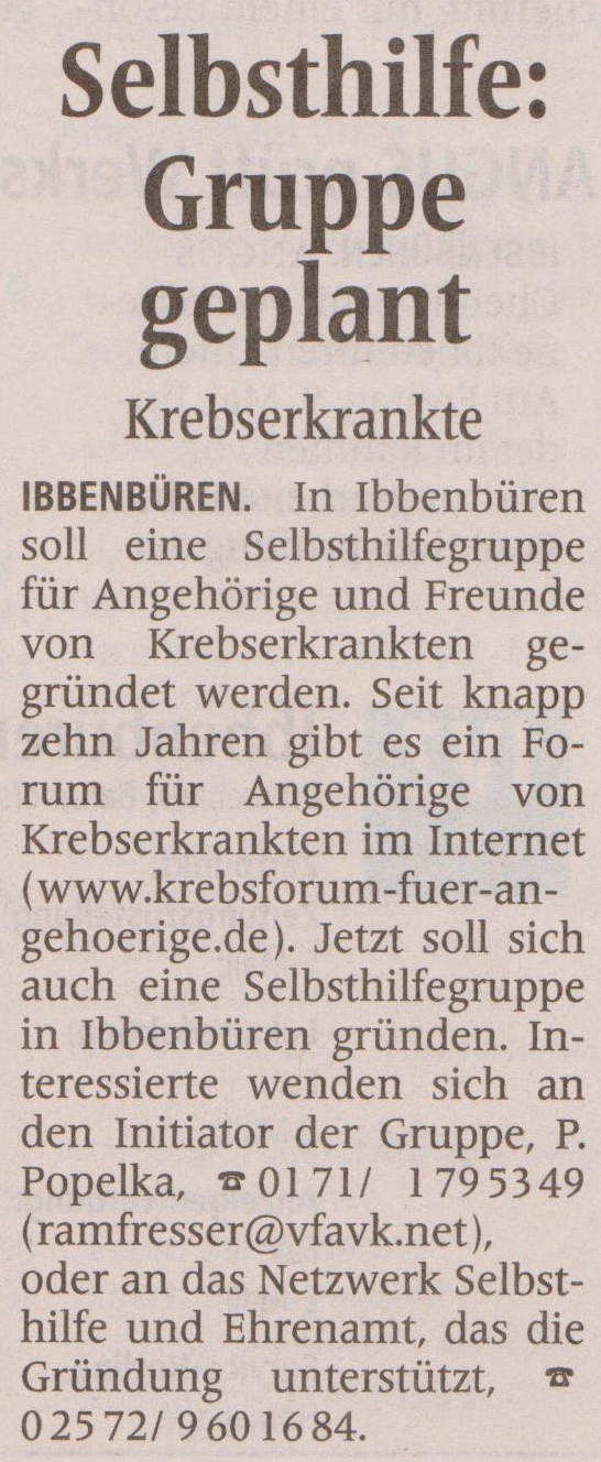 Die Ibbenbürender Tageszeitung IVZ hat einen Pressetext über die Gründung der Selbsthilfegruppe für Angehörige von Krebspatienten veröffentlicht und dabei auch die Url vom Forum mit gedruckt.